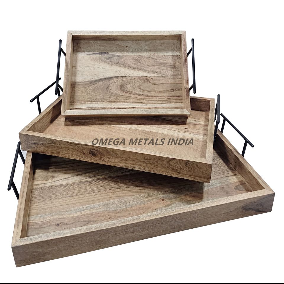 Plateau en bois de manguier de haute qualité avec poignées en métal noir durables et forme rectangulaire élégante pour un service et un affichage élégants