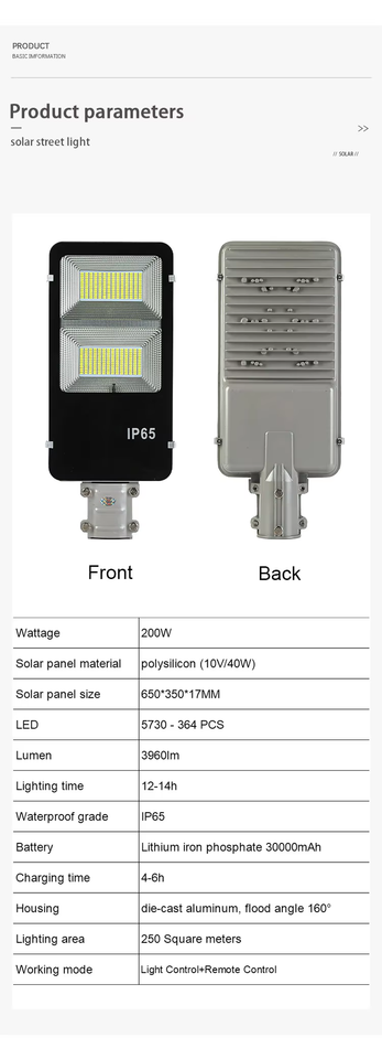 Réverbère solaire à lumen élevé 200W lumière LED étanche avec télécommande court pôle IP65 évalué pour une application routière