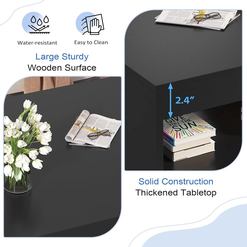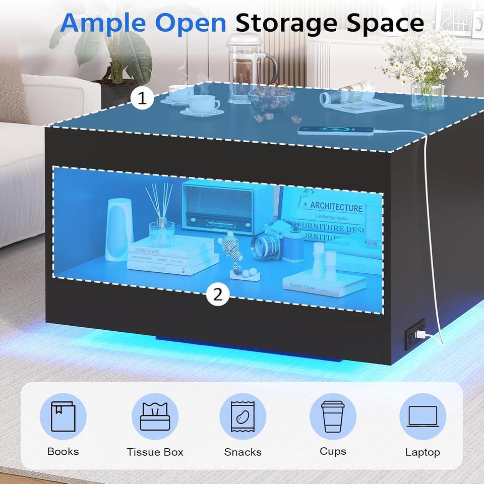 Table basse carrée noire en bois robuste avec éclairage LED et station de charge, faible MOQ, rangement ouvert