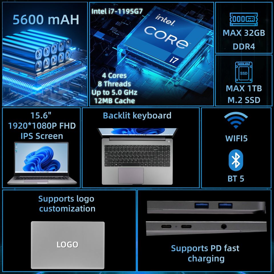 Ordinateur portable professionnel haute performance 15,6 pouces Intel Core i7-1195G7 16 Go de RAM 1 To SSD Boîtier métallique Charge rapide PD 65W Windows 11 PC
