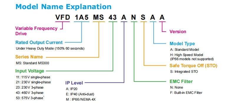 Haute Performance Delta VFD 0.2kw 110V VFD1A6MS11ANSAA AC Drive 1 Phase MS300 Series Largement utilisé en Stock