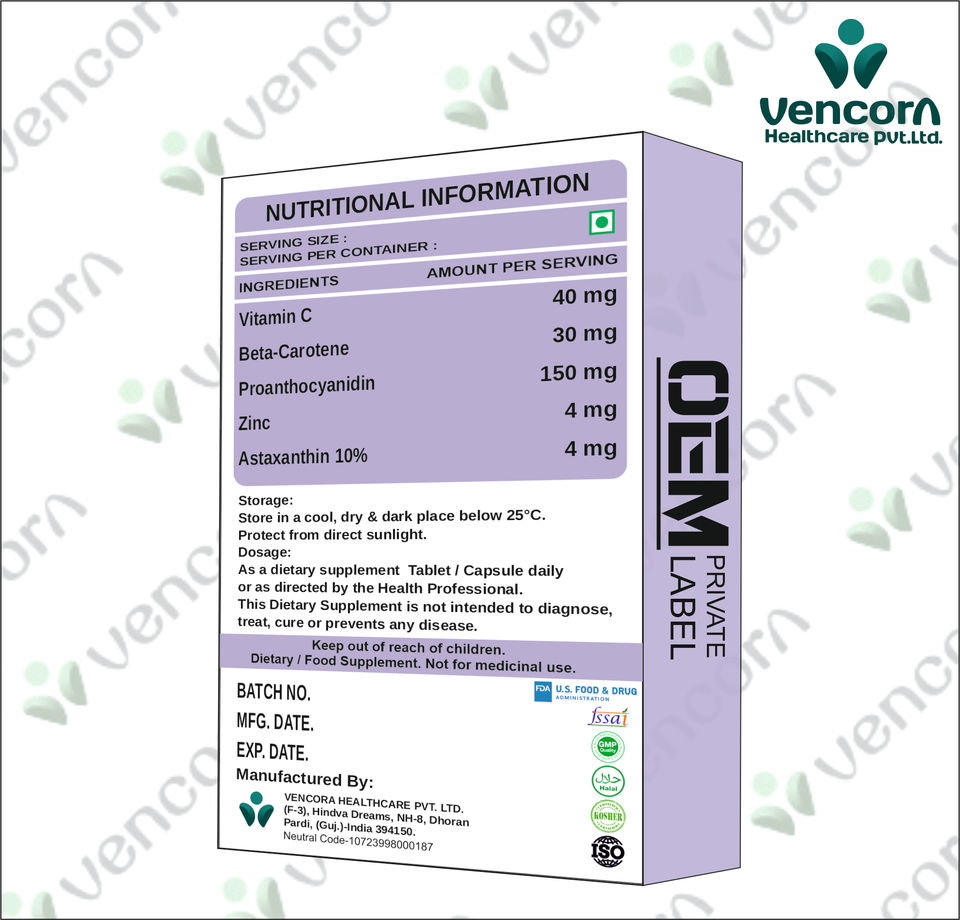 Ingrédient principal:Proanthocyanidine, VITAMIN C, BETA CAROTENE, ZINC, ASTAXANTHIN 10%
