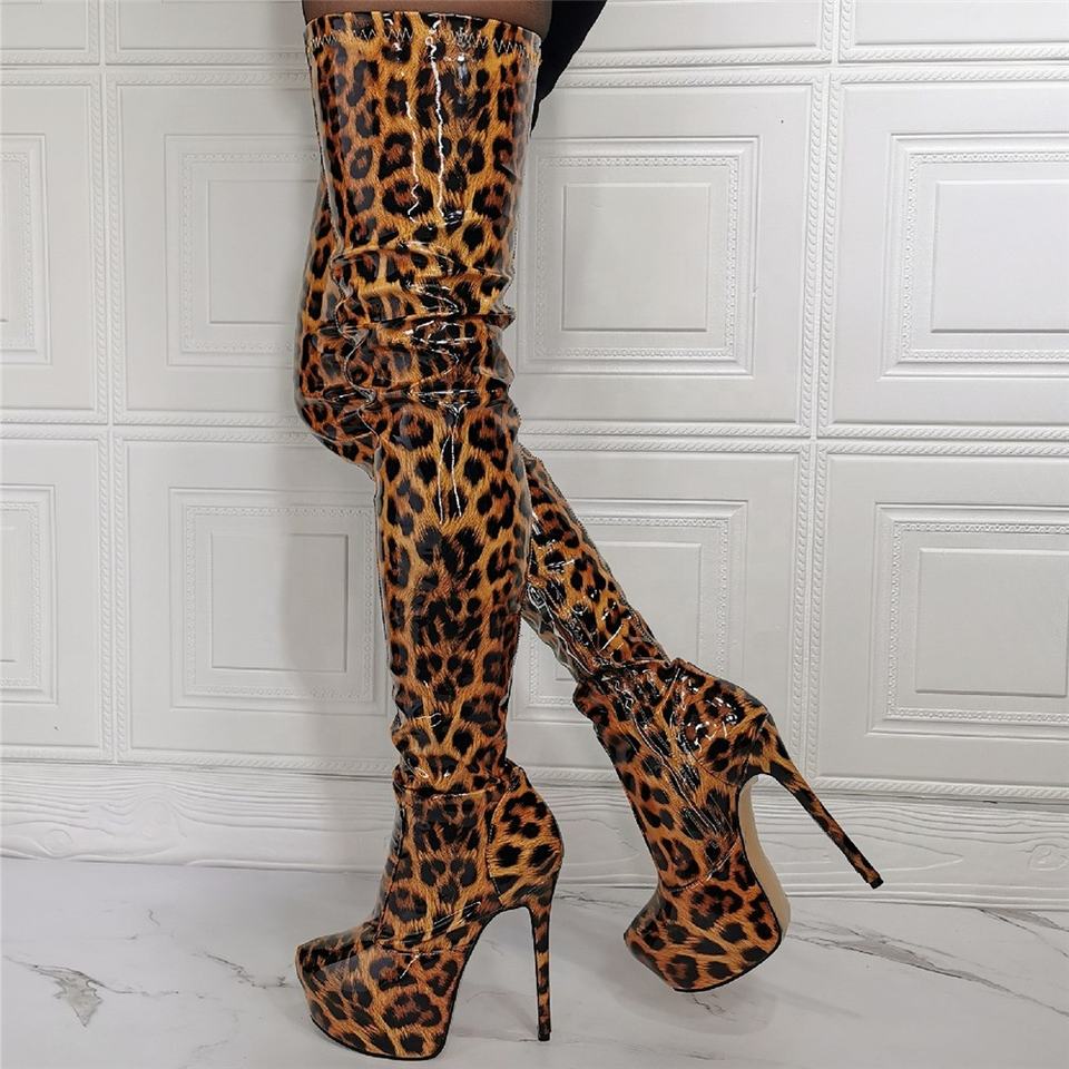 Bottines à plateforme haute à imprimé léopard pour femmes, chaussures moulantes au-dessus du genou, talons aiguilles, motif guépard, coupe large, taille 47