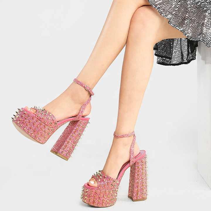 Sandales à plateforme haute avec rivets métalliques, talons épais brillants, chaussures d'été pour femmes, escarpins à talons