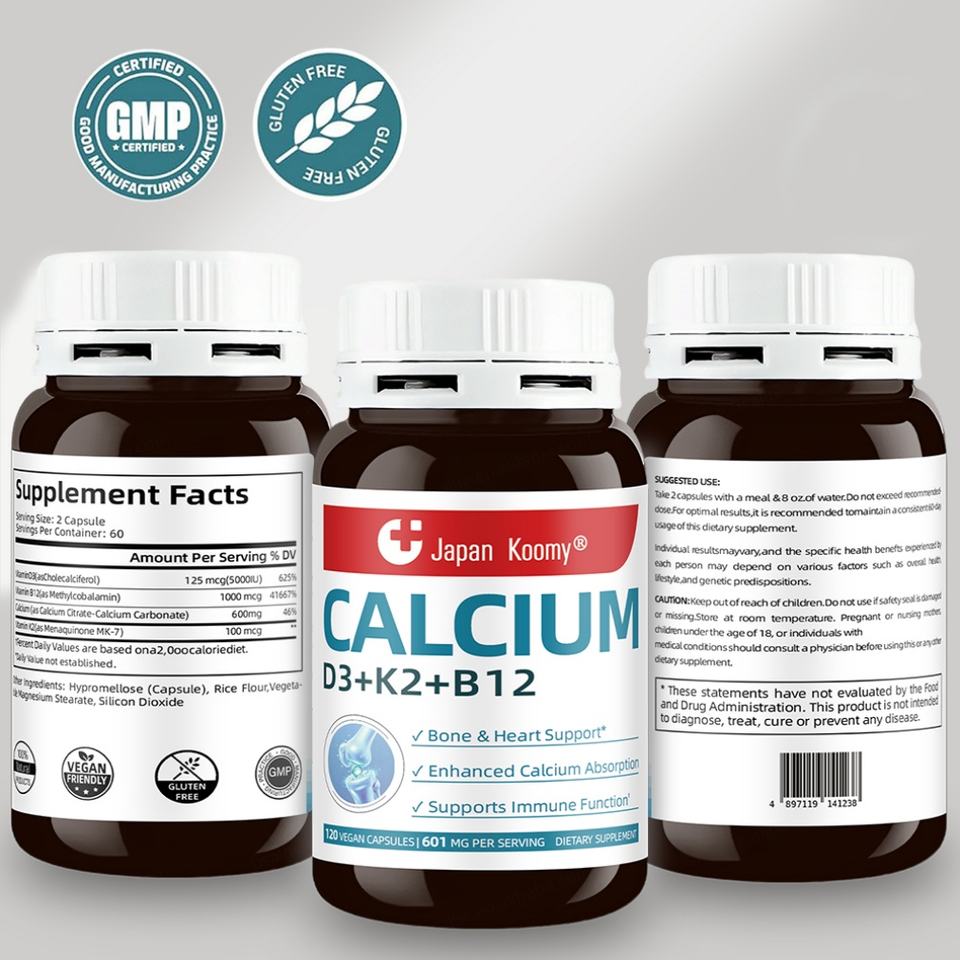 Complément de calcium D3+K2+B12 haute puissance, 120 capsules, soutient la fonction osseuse et musculaire
