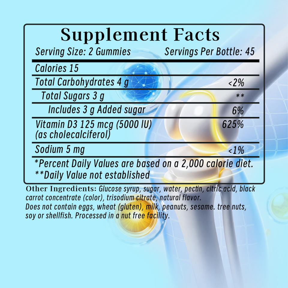 Gommes à haute puissance de vitamine D3 Le supplément de vitamine D3 favorise la force osseuse et musculaire 5000IU avec des bonbons au sodium 90