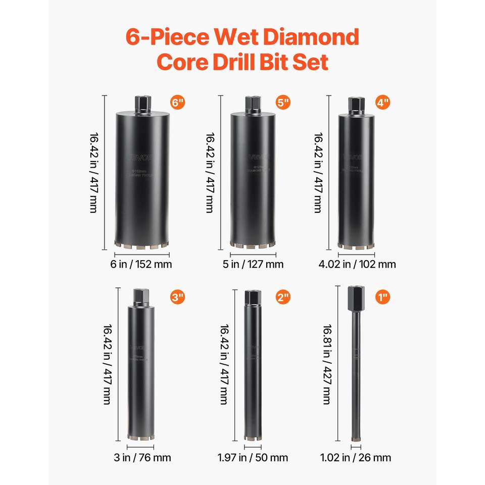 Jeu de 6 forets à noyau de haute précision de 1/2/3/4/5/6 pouces de diamètre pour maçonnerie et béton, profondeur de perçage de 14 pouces, 1-1/4 In-7