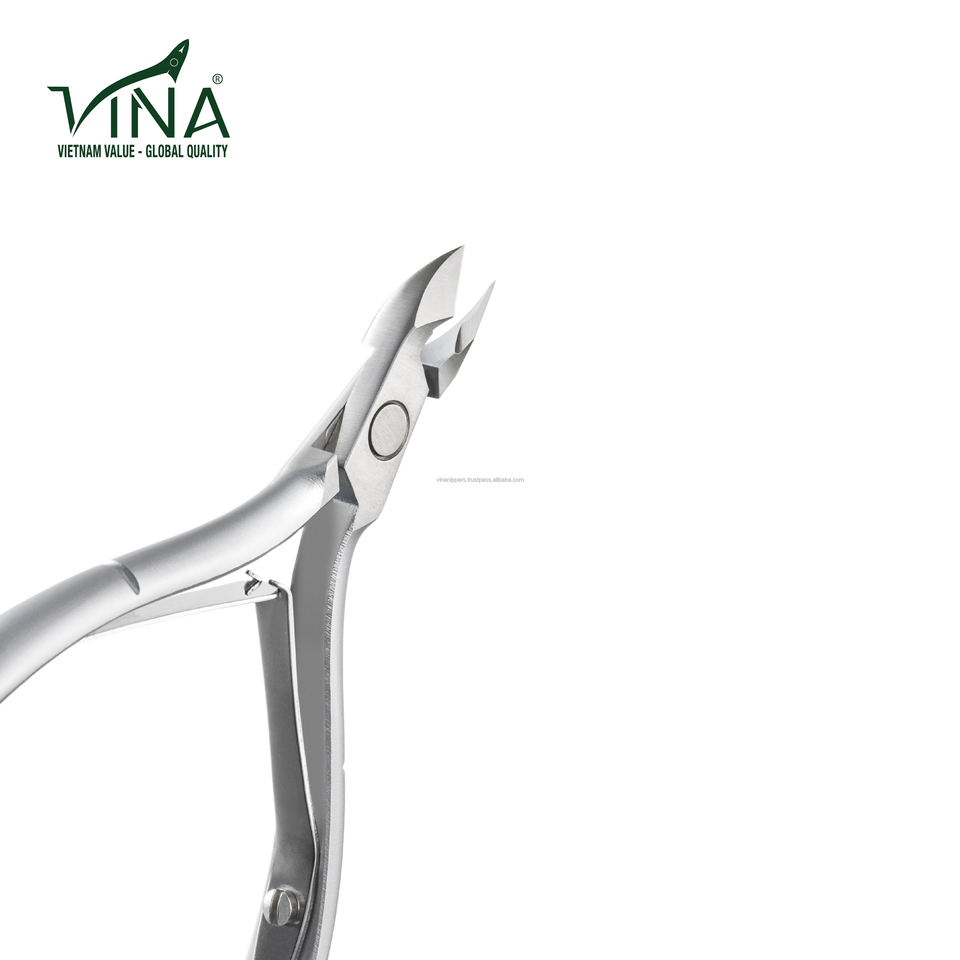 Pince à cuticules Vina VNC-06-GC en acier inoxydable gris à mâchoires biseautées de haute précision, manche long courbé pour usage sur les doigts, salons de manucure et spas