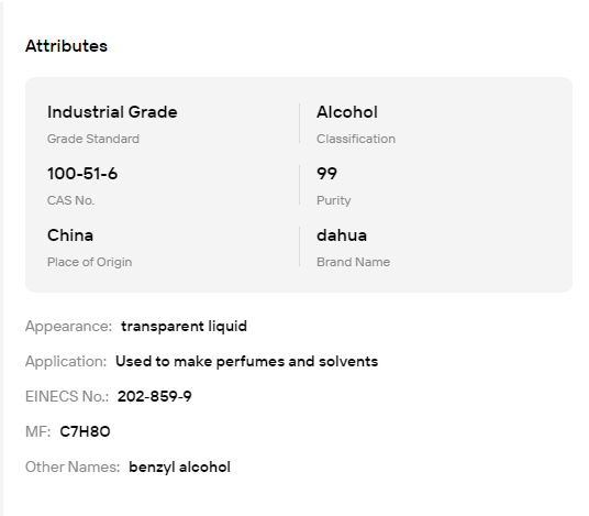 Alcool benzylique de haute pureté CAS 100-51-6 Qualité alimentaire et industrielle pour fixateur de parfum, solvant organique, conservateur cosmétique