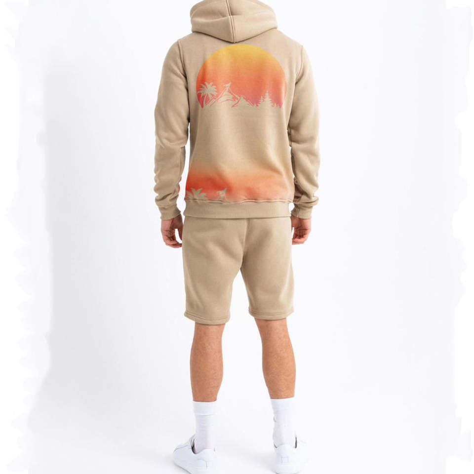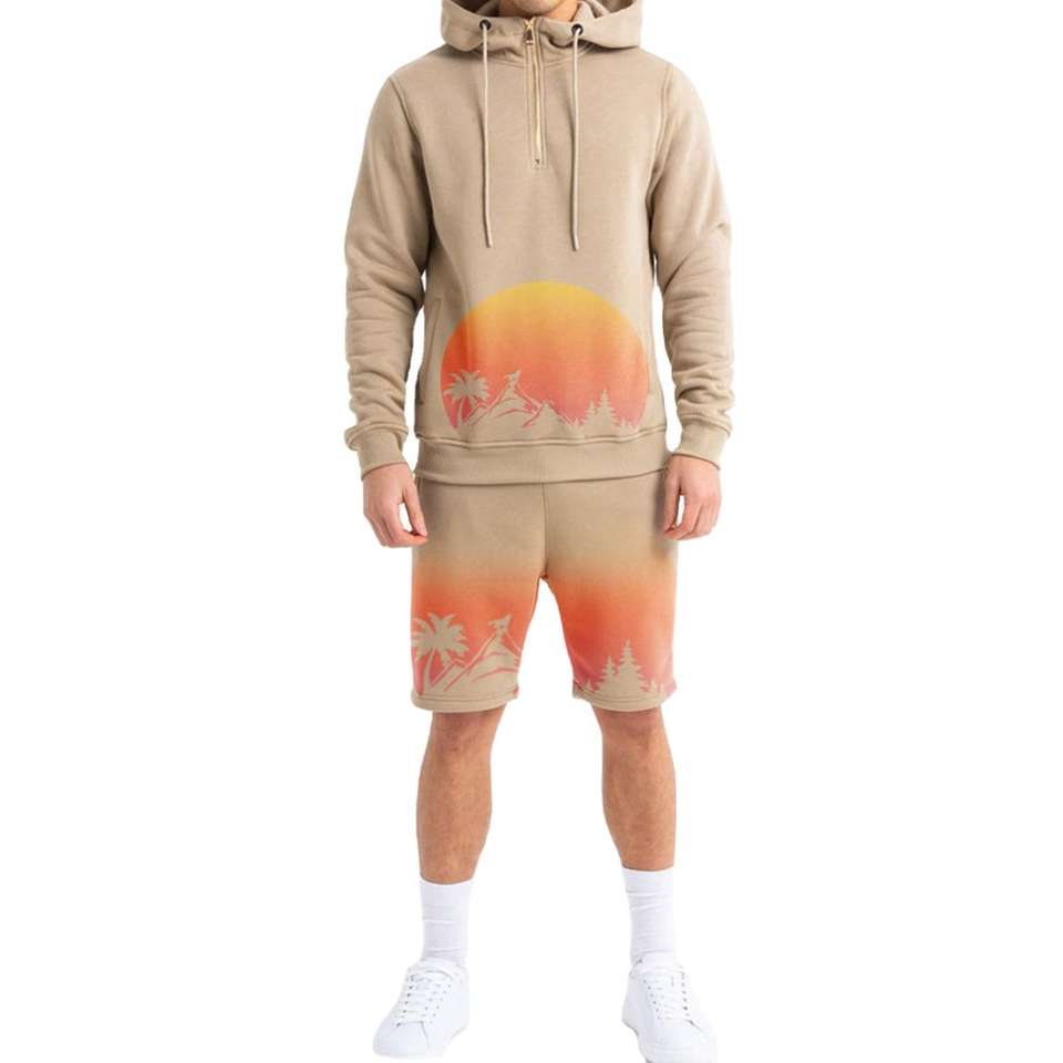Ensemble sweat à capuche zippé 1/4 et short assorti de haute qualité pour homme – Survêtement décontracté en molleton de coton imprimé coucher de soleil pour la plage