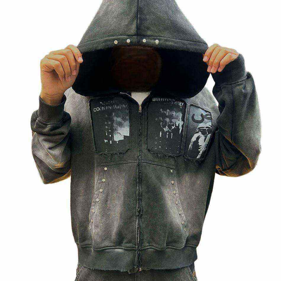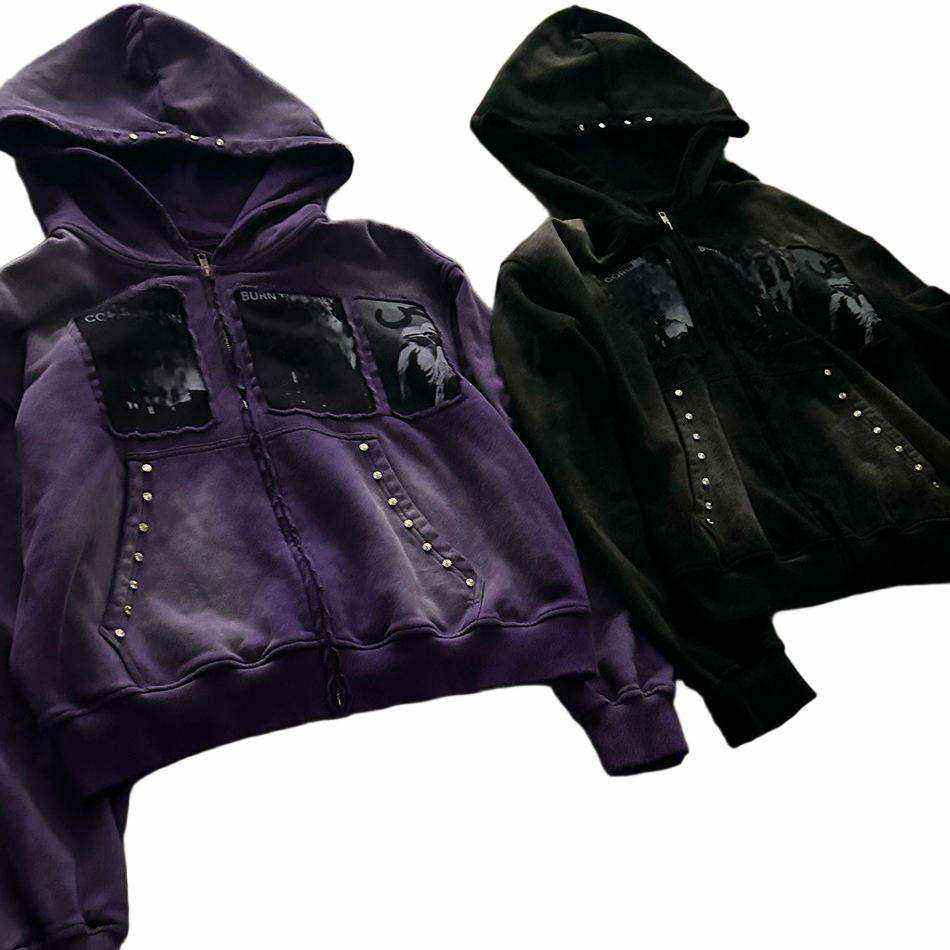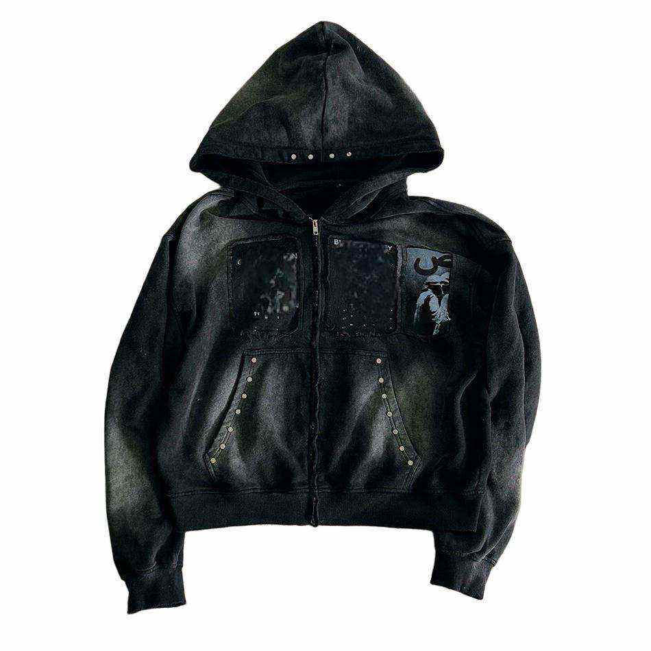 Sweat à capuche zippé unisexe en coton 100% de haute qualité, brodé, effet délavé par le soleil, poids lourd 500 g/m², style streetwear ample avec strass