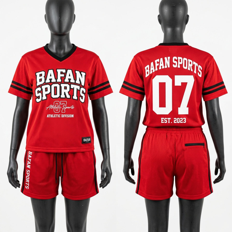 Ensemble short et maillot en maille poly 165 GSM de haute qualité pour femme, motif rayé rouge et noir sur les manches, logo personnalisé, ensembles pour femme