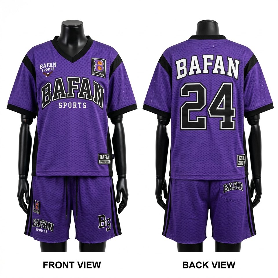 Ensemble short et maillot pour femme en maille poly 165 GSM de haute qualité, design à empiècements violet et noir, léger, avec logo personnalisé