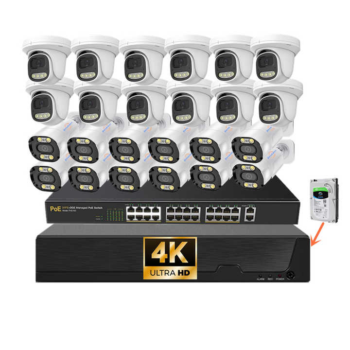 12 caméras extérieures + 12 caméras intérieures + switch PoE 24 canaux + NVR 36 canaux + 6 To