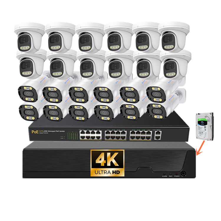 Système de caméra de sécurité CCTV IP66 NVR 4K 8MP 24 canaux de haute qualité avec disque dur, accès à distance par application et enregistrement audio