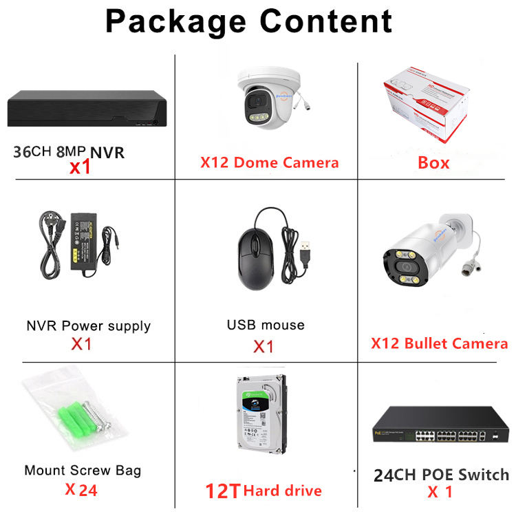 articles emballés:12 caméras extérieures + 12 caméras intérieures + switch PoE 24 canaux + NVR 36 canaux + 6 To