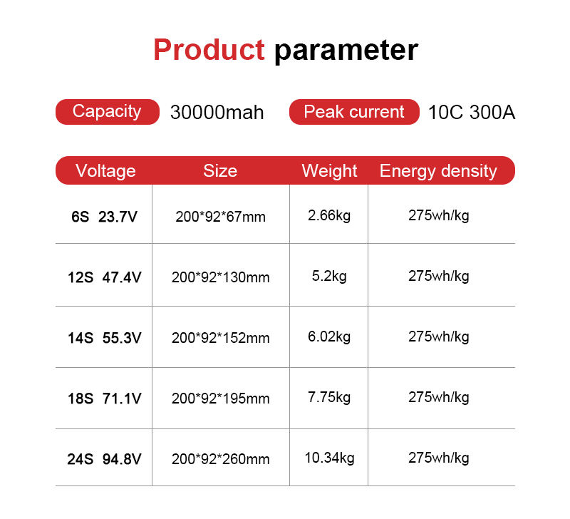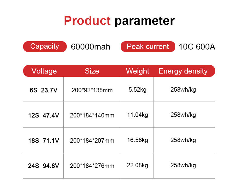 Nominal Voltage:3.95v/1s 23.7v/6s 47.4v/12s 55.3v/14s