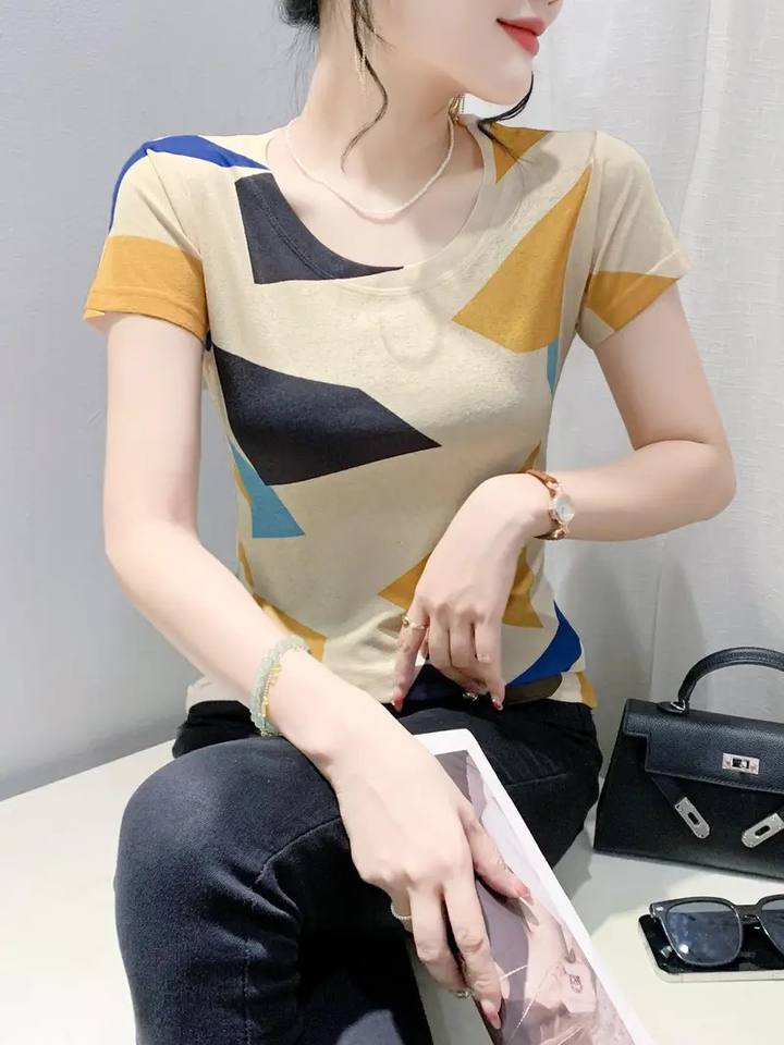 Haute qualité 3D coloré Geo impression col rond décontracté à manches courtes T-Shirt respirant séchage rapide femmes printemps été Bangladesh