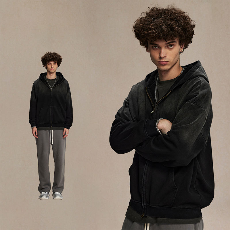 High Quality 450GSM Hoodie Men Vintage Streetwear Oversized Zip-Up Hoodies Gradient Wash Hip Hop Custom Spray Dyed Blank Hoodies
