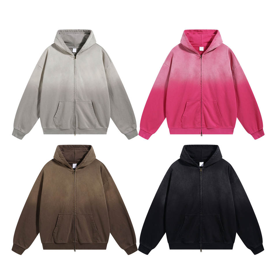 Sweat à capuche zippé de haute qualité 450GSM pour homme, streetwear rétro, surdimensionné, dégradé, délavé à l'acide, en molleton français, teinture personnalisée par pulvérisation, automne uni