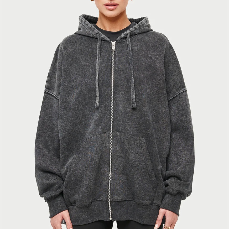 Product name:Women Down Shoulder Acid Wash Zipper Hoodies