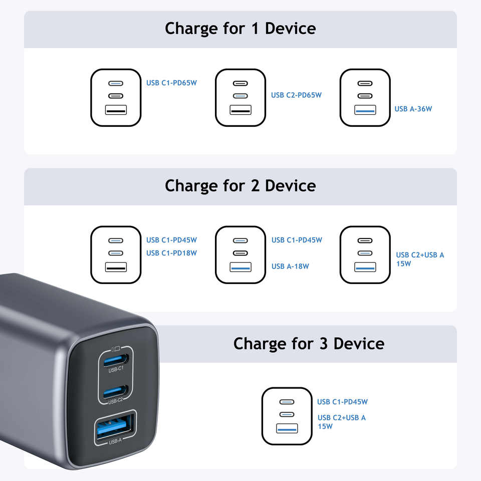 Haute qualité 65W PD voyage chargeur USB Qc 3.0 adaptateur mural Super rapide ordinateur portable GAN matériel sûr Smart Compatible EU US Sockets