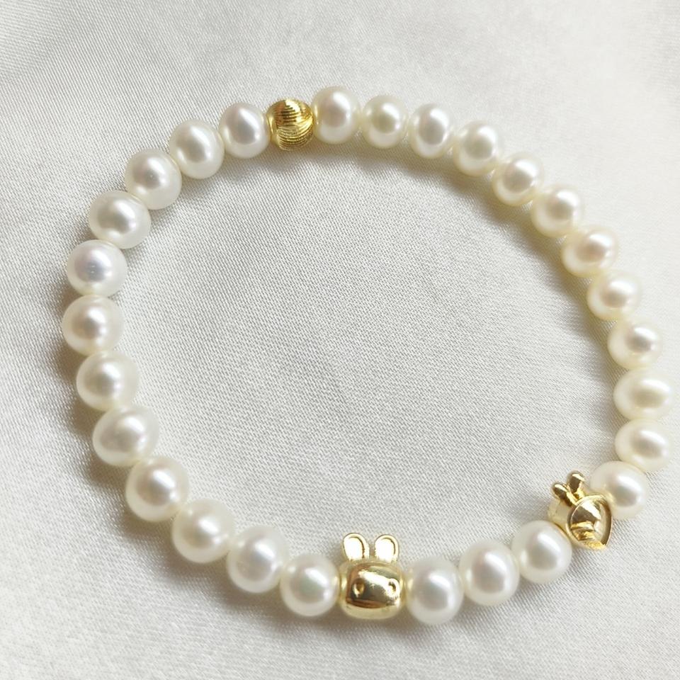 Bracelet en perles d'eau douce de haute qualité 6 mm avec petit charme lapin sur cordon élastique, style rafraîchissant et propre, presque sans défaut