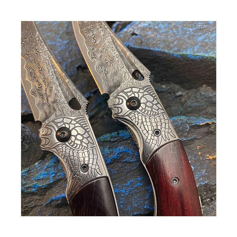 Couteau pliant de haute qualité en acier Damas à 73 couches avec manche en bois d'ébène et bolster en Damas