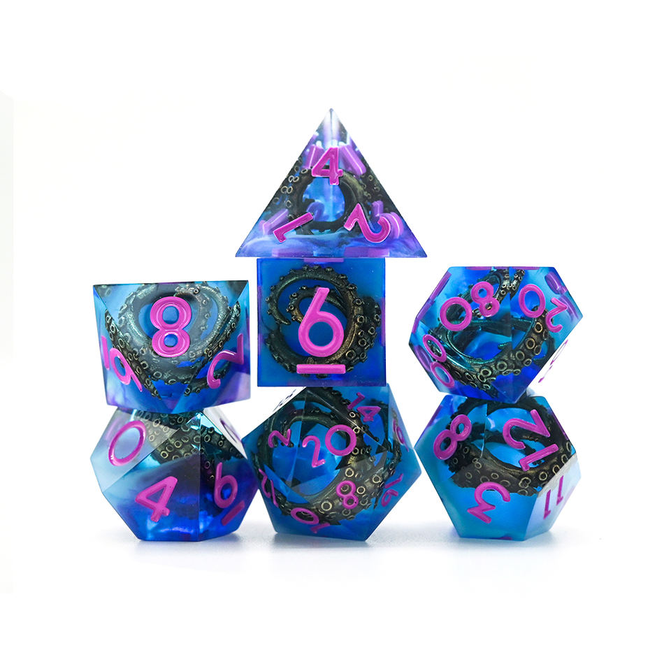 Ensemble de dés polyédriques de haute qualité 7 pièces, poulpe à l'intérieur, dés en résine transparente bleue avec des chiffres roses pour Donjons et Dragons