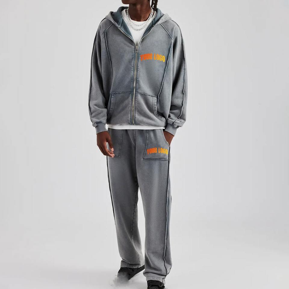 Sweat à capuche zippé deux pièces délavé à l'acide de haute qualité et ensemble de joggings évasés délavés à l'acide survêtement à logo brodé personnalisé
