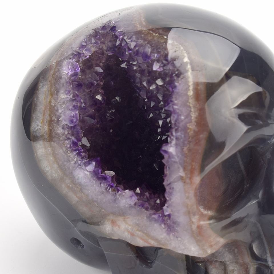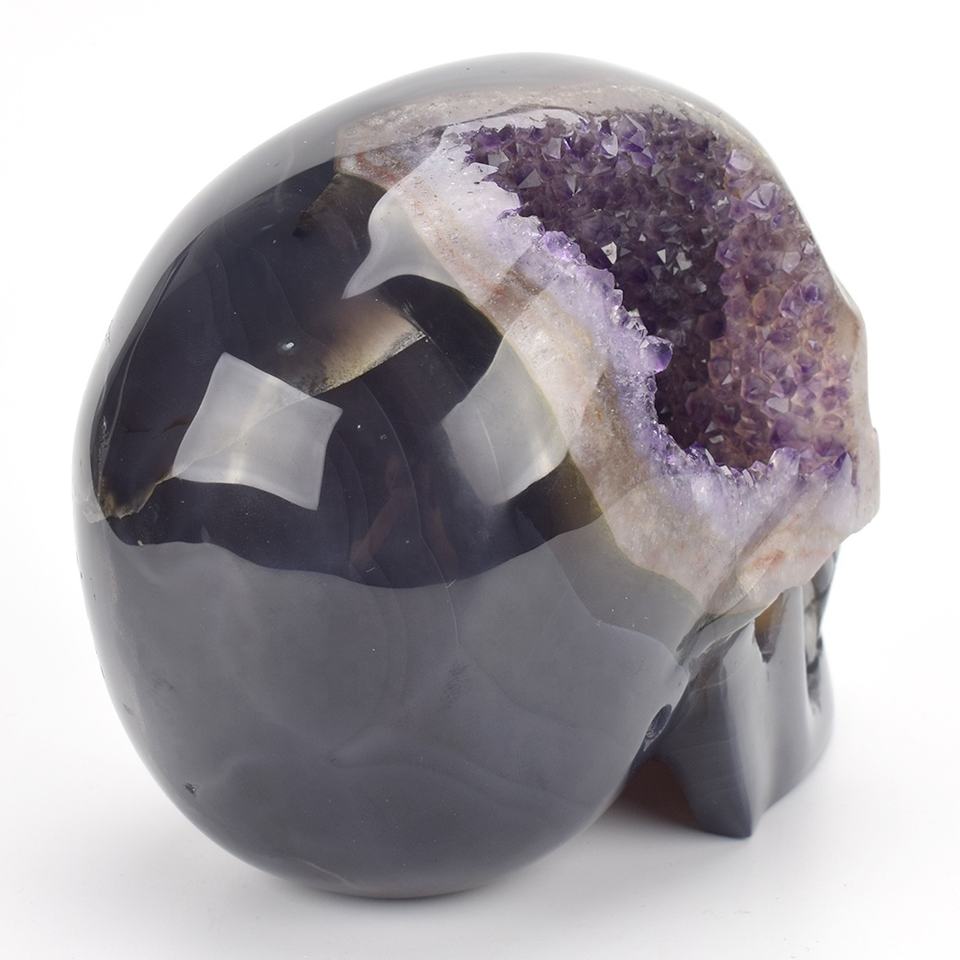 Groupe de géodes d'améthyste de haute qualité, crâne de cristal grandeur nature