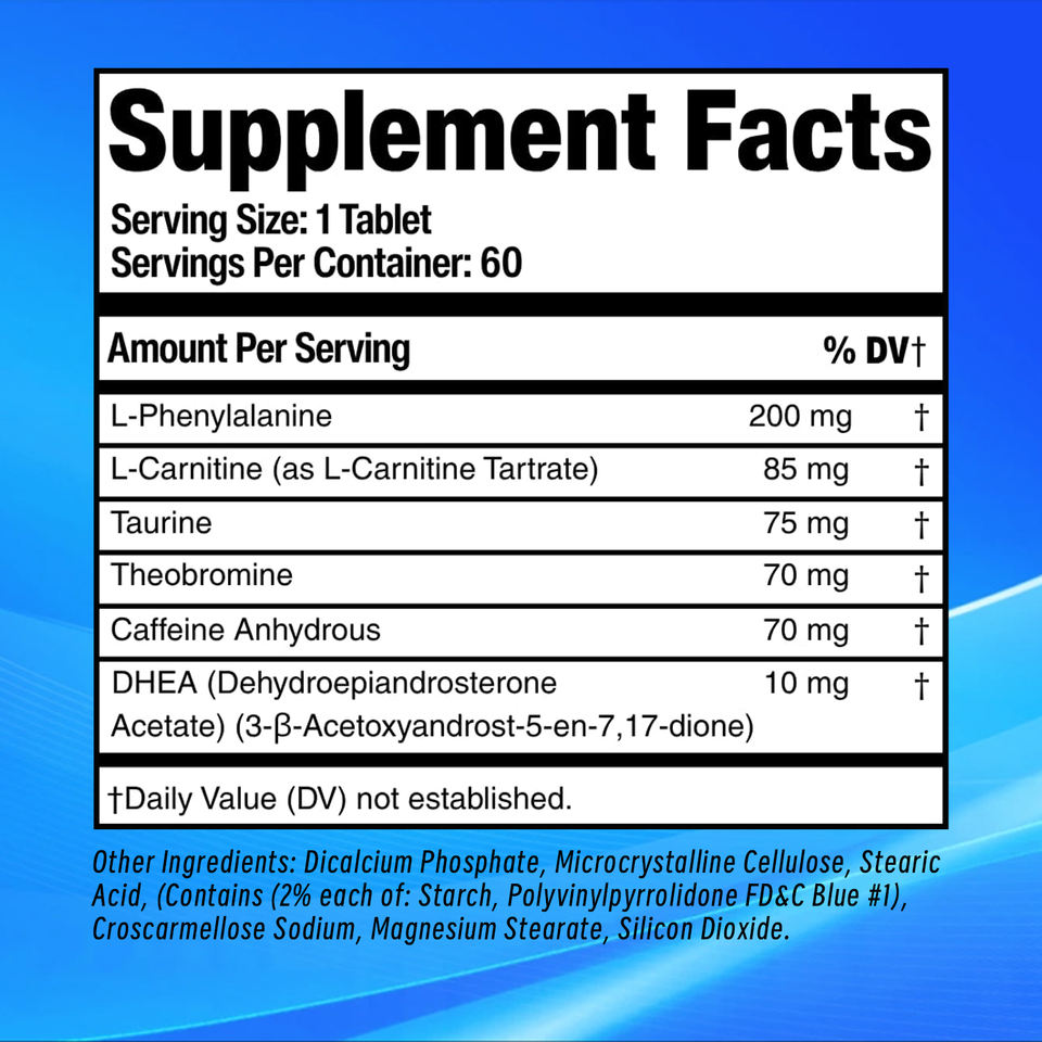 Main Ingredient:L-Phenylalanine, L-Carnitine Tartrate, Taurine, Theobromine, Caffeine Anhydrous
