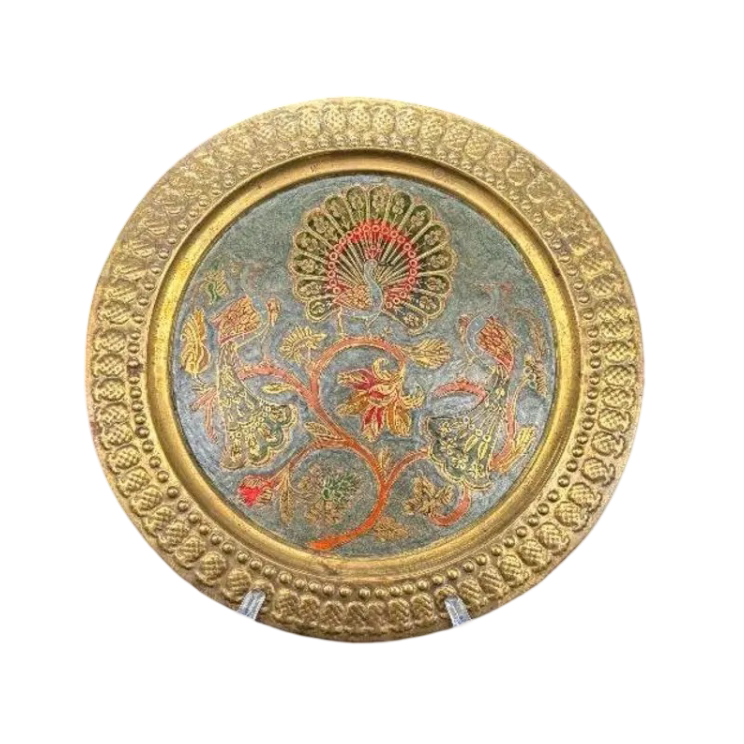Assiette ronde en laiton arabe de haute qualité avec gravure multicolore et finition polie pour une utilisation en cuisine et comme assiette décorative