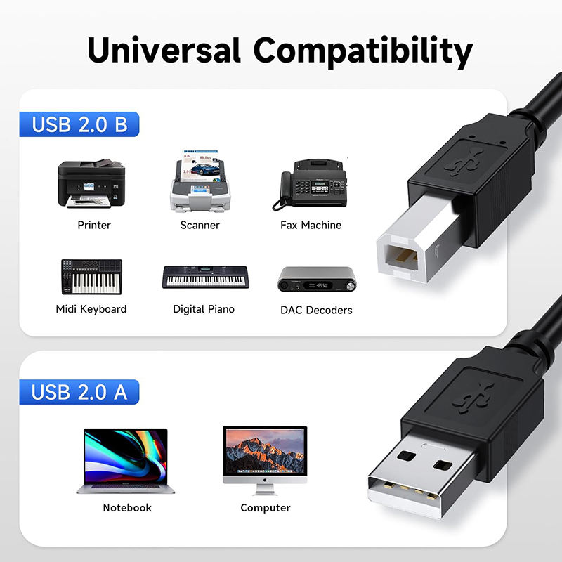 Câble USB 2.0 noir de haute qualité, Type A mâle vers Type B mâle, blindé tressé, pour imprimantes Epson, Canon, HP et appareils photo