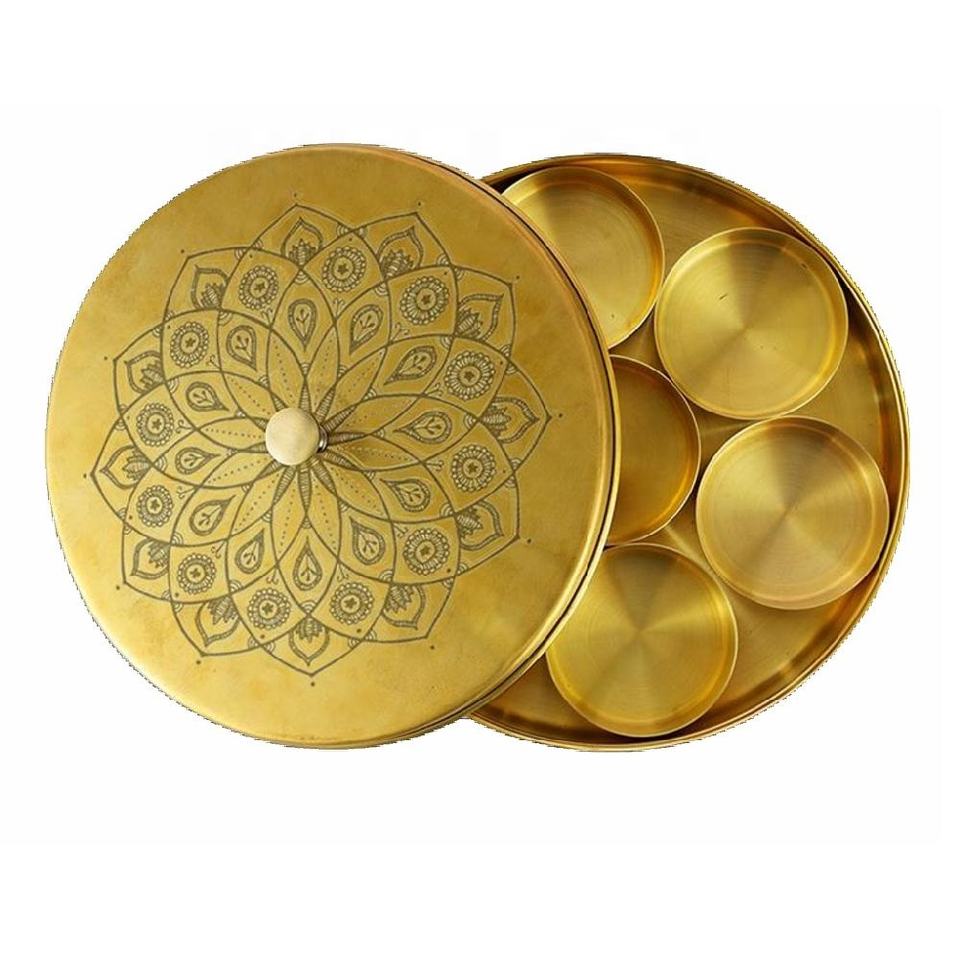 Ensemble de boîtes à épices en laiton de haute qualité, design mandala sur le couvercle, 7 contenants, boîte de rangement pour épices, organisateur de masala, ustensiles de cuisine