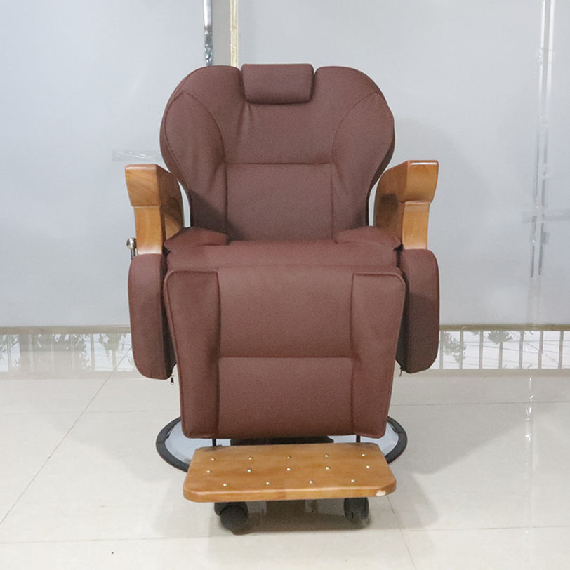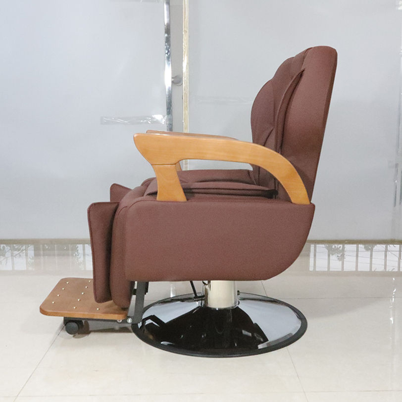 Chaise de coiffure en cuir PU brun de haute qualité, accoudoirs en bois, robuste, chaise de barbier professionnelle pour hommes