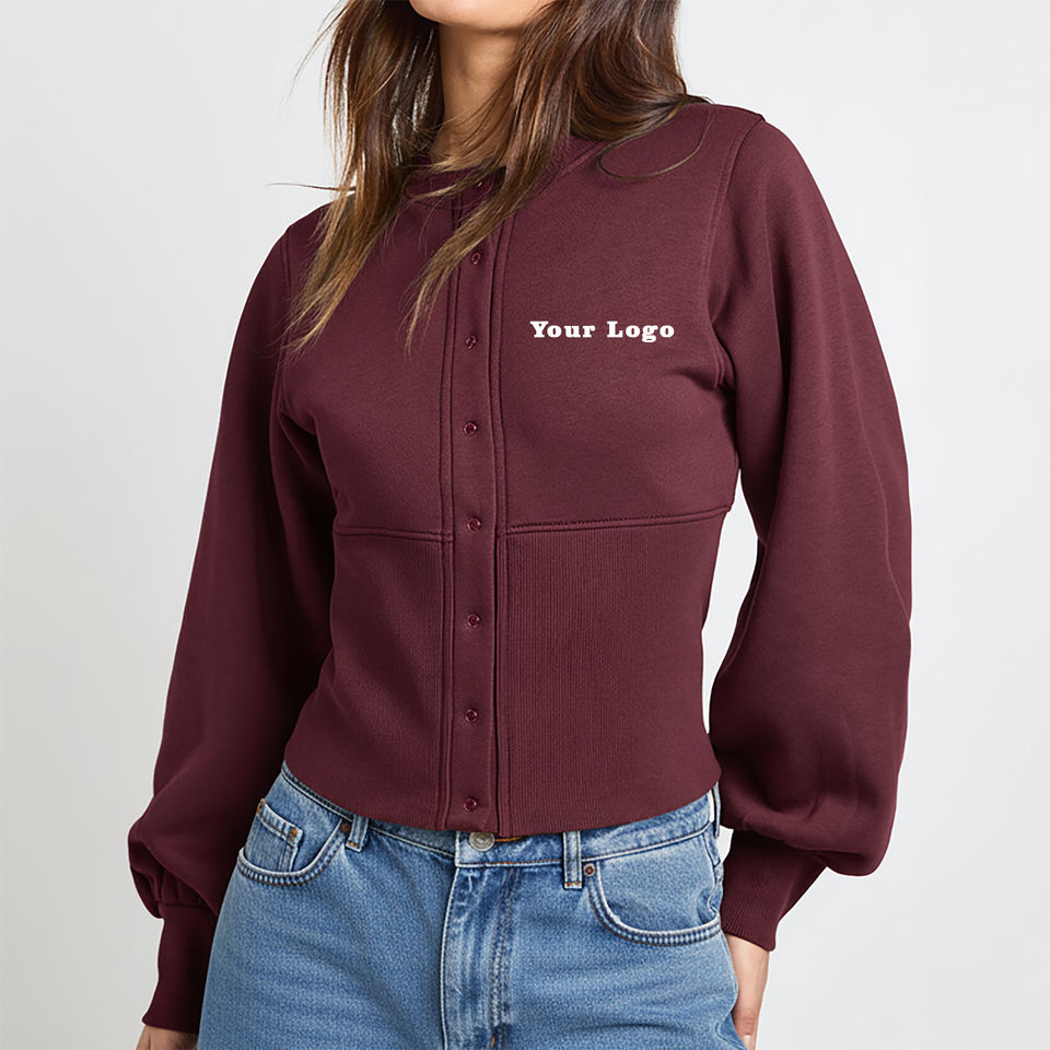 Sweat-shirt en molleton 100% coton de haute qualité avec fermeture à boutons, col rond, sur mesure, vêtements décontractés élégants pour femmes