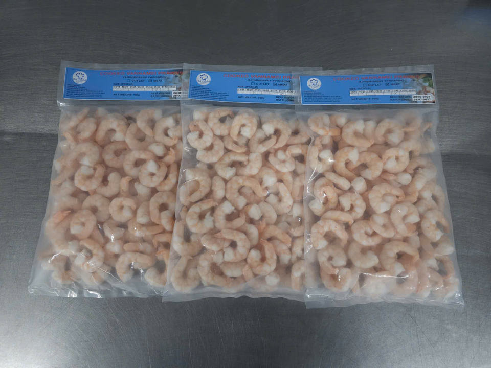 Contenu :Crevettes Vannamei surgelées, cuites, épluchées et désveinées, avec queue.
