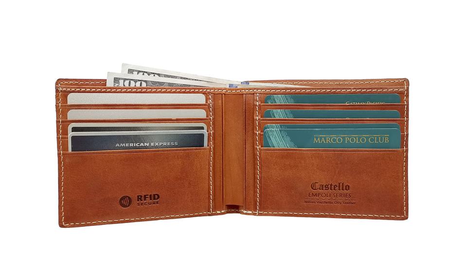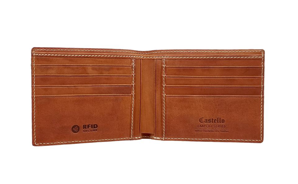High Quality Castello Italian Vacchetta Leather RFID Bi-Fold Billfold ID Card Wallet for Men Short Length Polyester Opening
