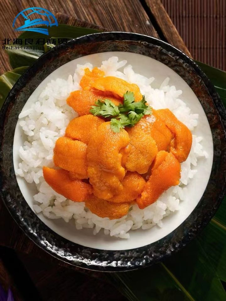 Œufs d'oursins congelés colorés de haute qualité, emballés en boîte, snacks de fruits de mer cuits au four avec saveur d'alcool