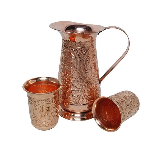 Pichet de service à eau en cuivre de haute qualité et ensemble de verres pichet fantaisie avec théière et bouilloires au design brillant et martelé