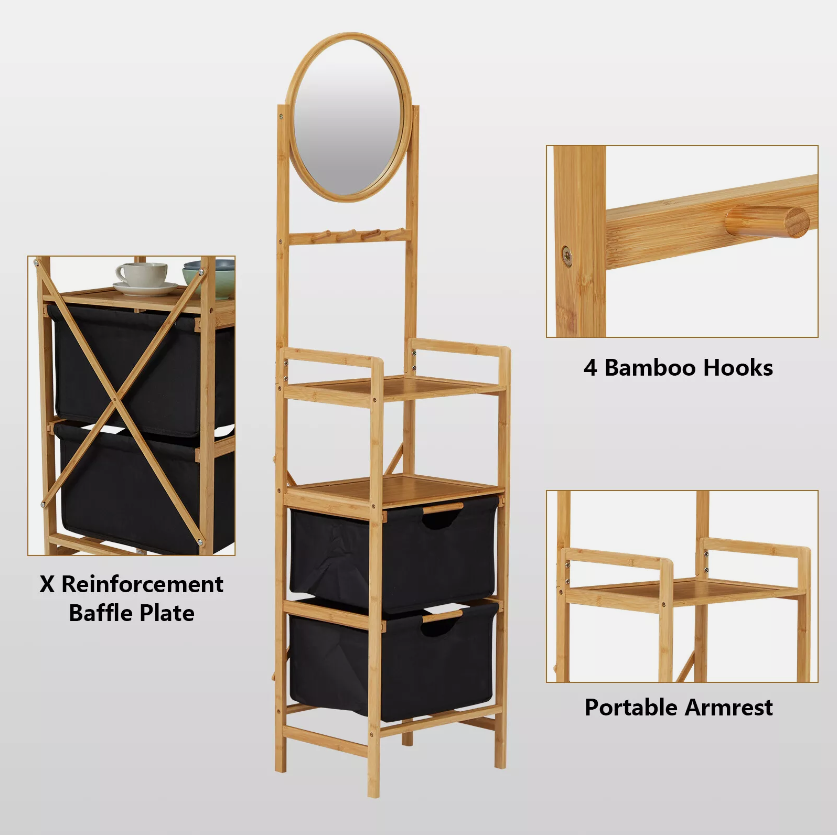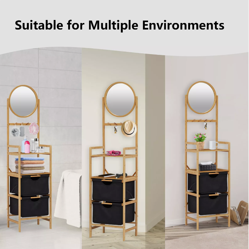 Étagère de rangement de salle de bain en bambou personnalisée de haute qualité avec miroir échelle de toilette tiroir en tissu pour articles divers pour l'organisation