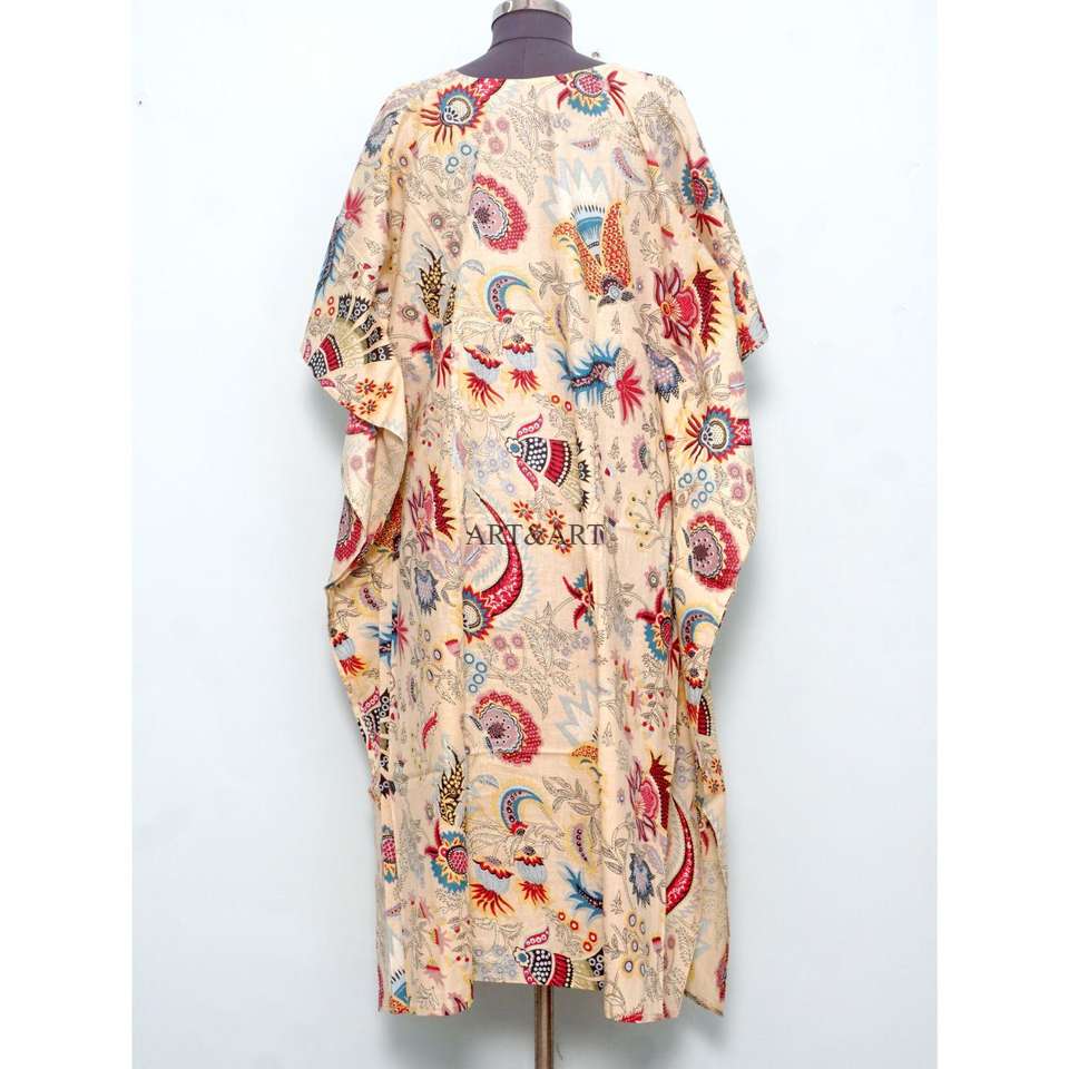 Robe Kaftan Longue d'Été pour Femme en Coton Biologique 100% de Haute Qualité, Imprimée au Bloc, Taille Naturelle, Idéale pour la Plage