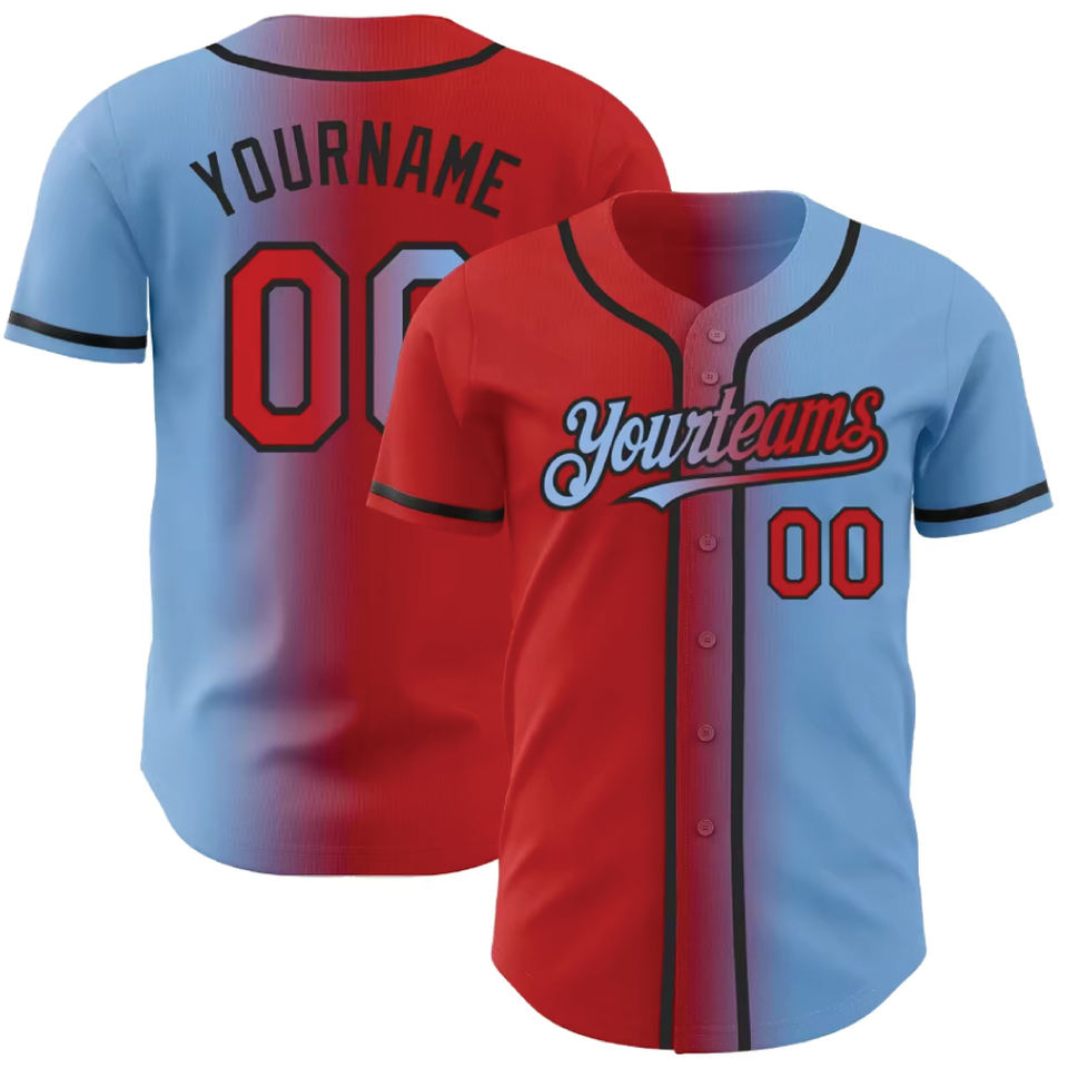 Maillots de baseball personnalisés de haute qualité en polyester respirant à col en V, dégradé authentique orange, rose et bleu clair, tendance