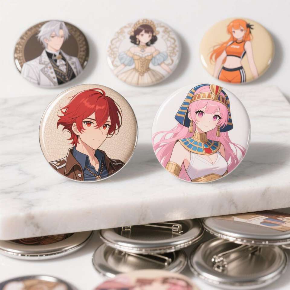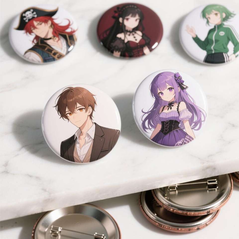 Badge rond en étain personnalisé de haute qualité, motif de personnage de manga mignon, écologique, cadeaux kawaii pour otaku, technique de peinture imprimée UV