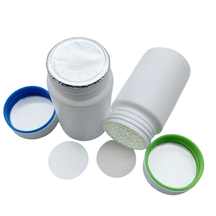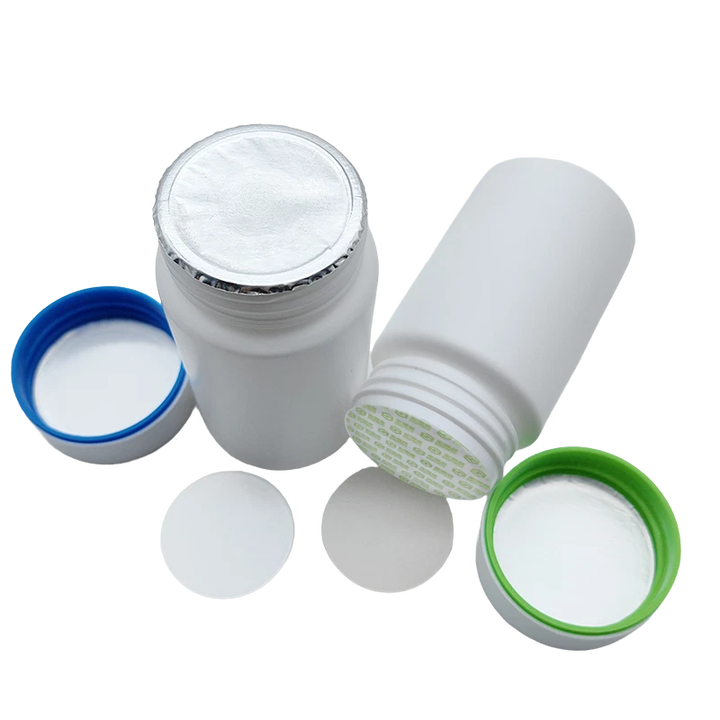 Capuchons de bouteilles pharmaceutiques de qualité supérieure, personnalisés, en papier laminé blanc avec joint en feuille métallique, pour bocaux