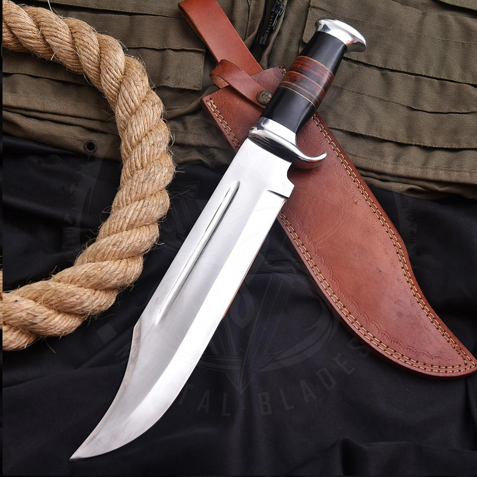 Couteau de chasse Bowie de haute qualité, fait main, en acier D2, lame polie miroir, manche en cuir, cadeau idéal, étui en cuir offert