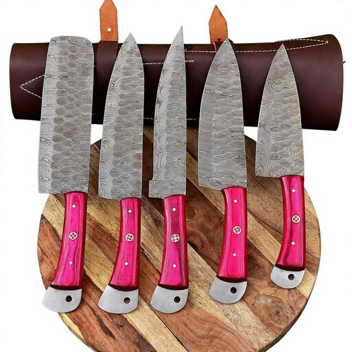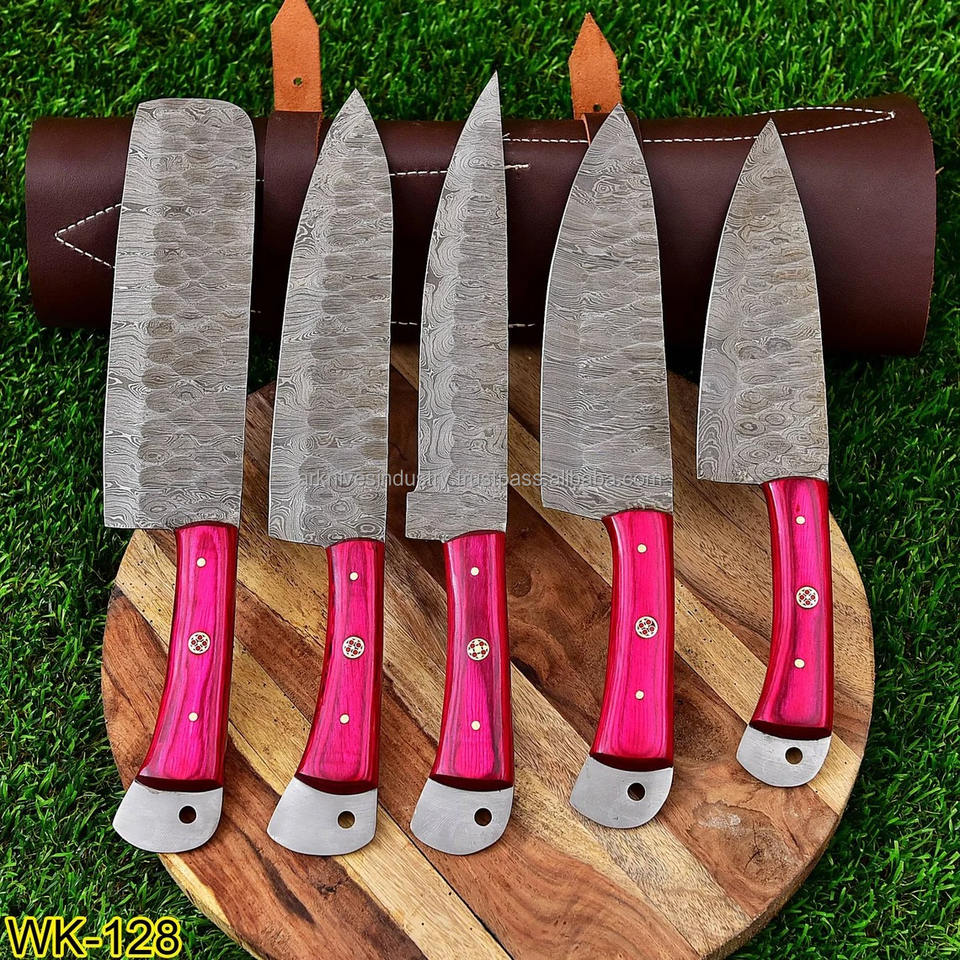 Ensemble de couteaux de chef en acier Damas faits à la main de haute qualité, 5 pièces, ambidextres, manche en bois Pakka écologique, vente en gros