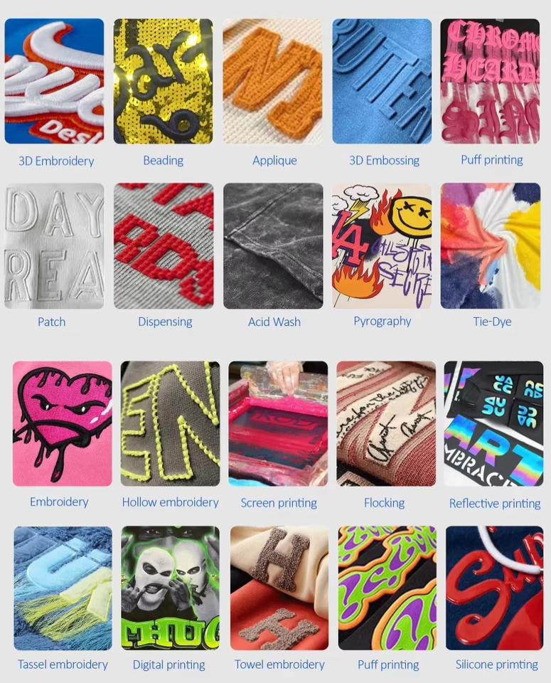 impression de décharge, Tie-dye, Impression Puff, EMBOSSÉ, Impression de Chaleur-transfert, Impression numérique, IMPRESSION D'ÉCRAN DE SOIE