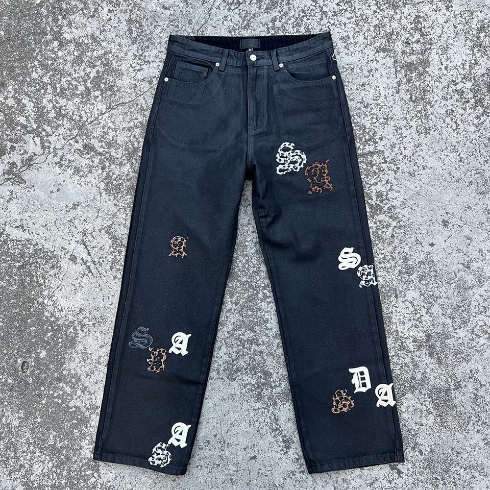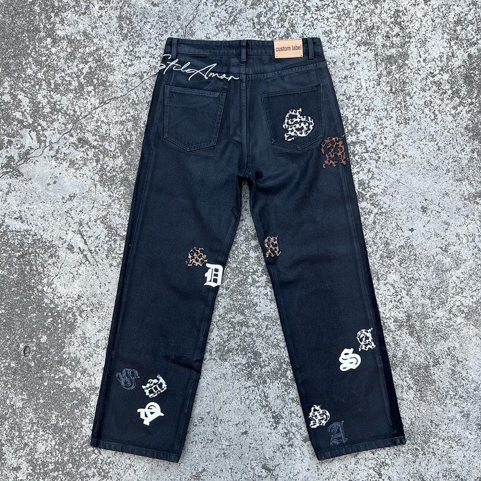 Jeans en denim ciré pour homme de haute qualité, logo personnalisé, style Y2K, taille plus, patchwork de fourrure, ample, droit, jambe large, noir